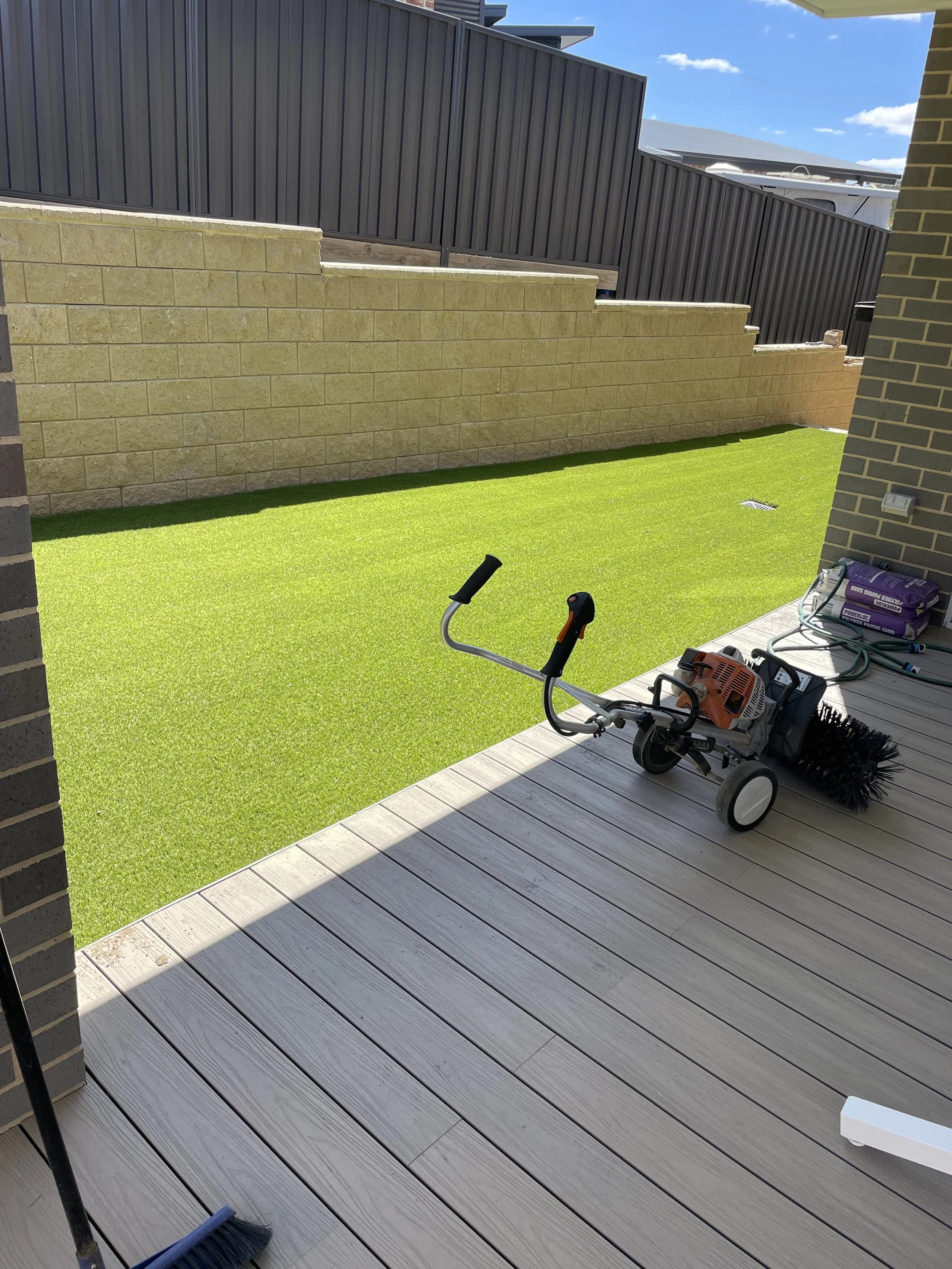 Each installation depends on the surface and site, but generally we remove 60–80mm of existing soil, lay a compacted base of blue metal dust, and carefully install and secure the turf with professional joining, edging, and sand infill for durability. For upkeep, artificial turf in Canberra is virtually maintenance-free. Just use a blower to clear leaves (never a rake). For high foot traffic areas, a power broom once or twice a year helps keep the blades standing tall. We can provide this service or you can hire a power broom if needed.